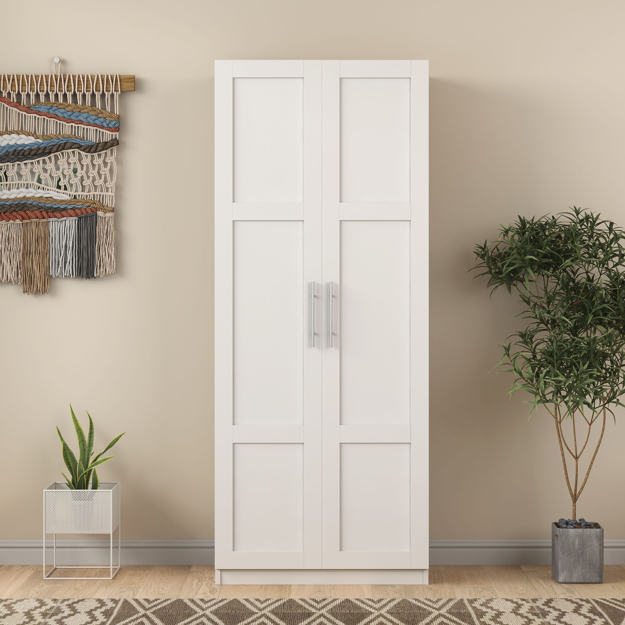 High wardrobe and kitchen cabinet with 2 doors and 3 partitions to separate 4 storage spaces,white