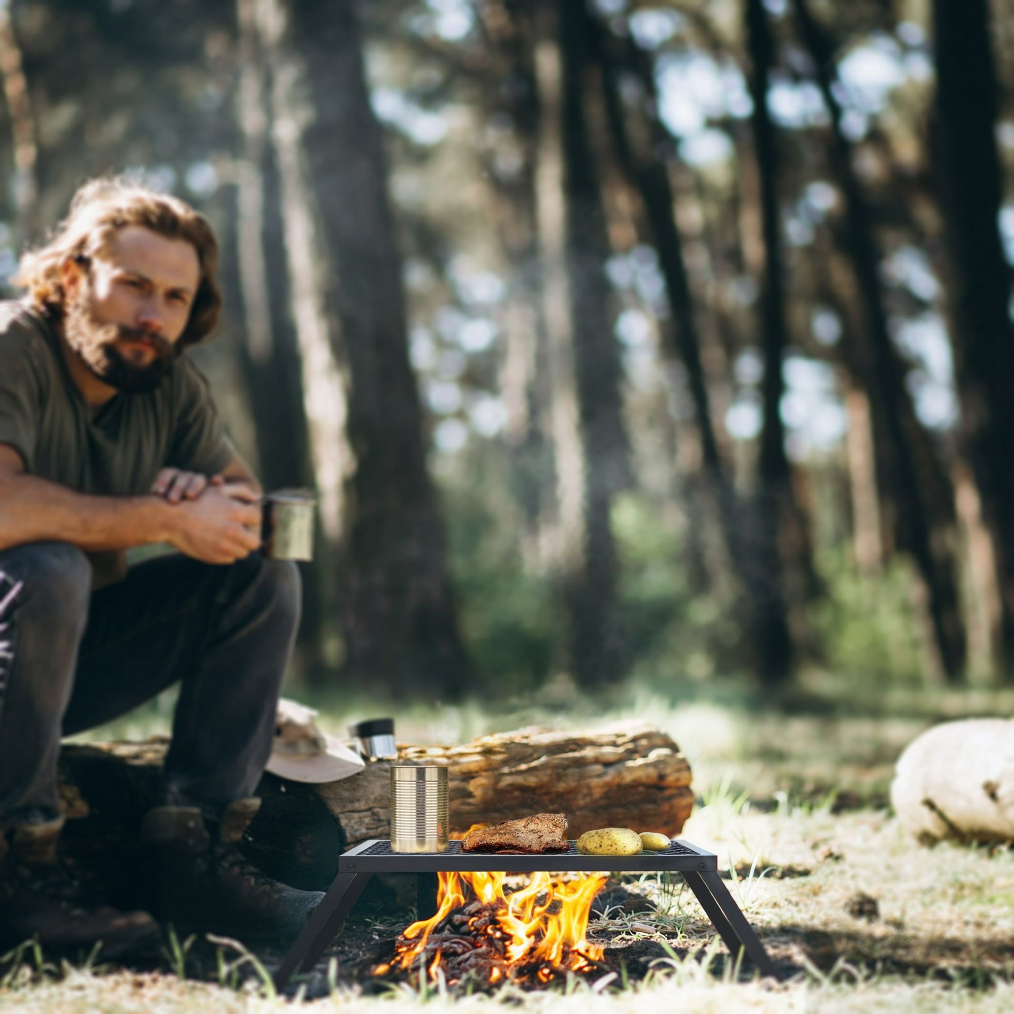 Heavy-Duty Carbon Steel Campfire Grill, 24" x 16", Foldable Legs, Black