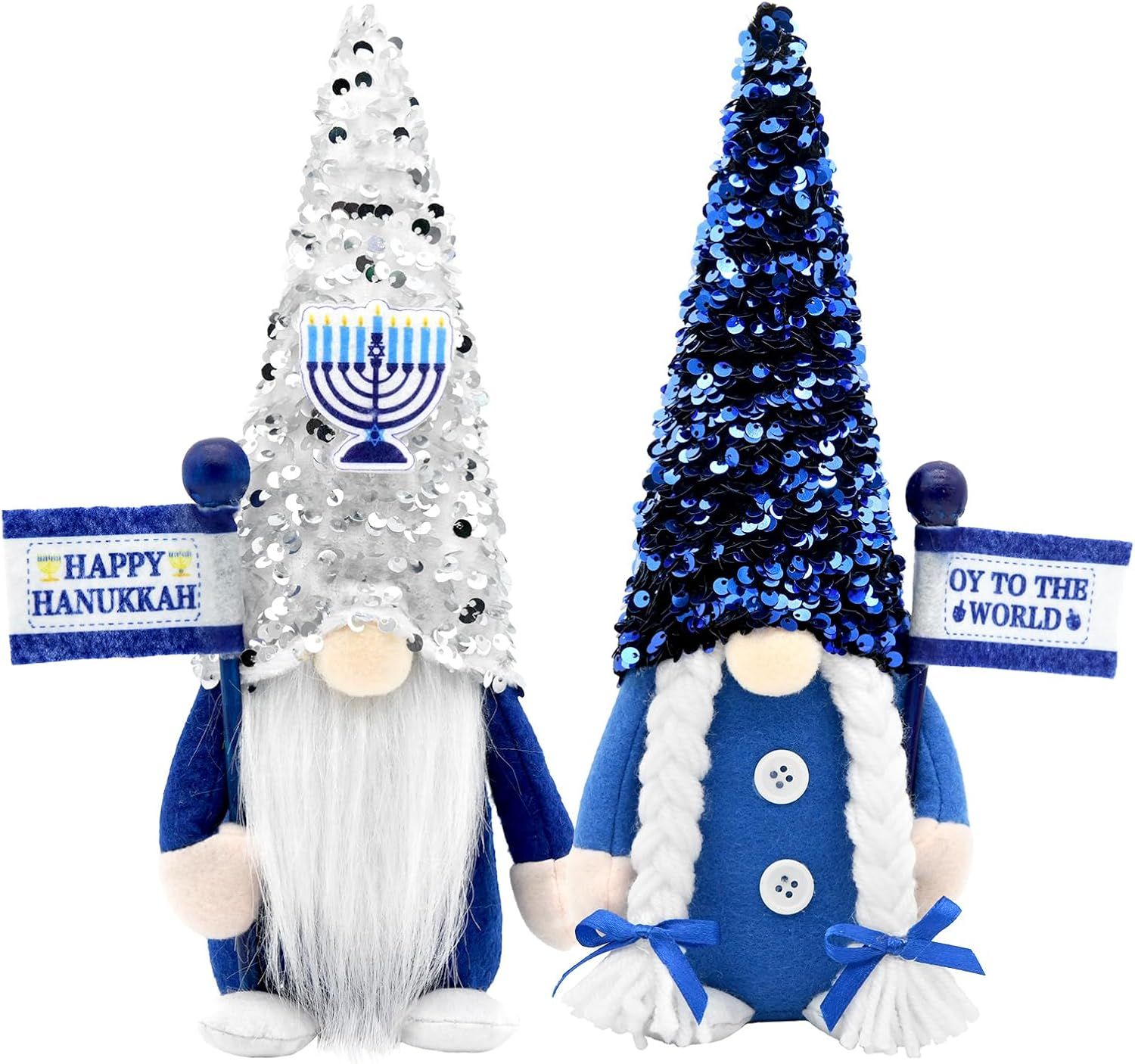 HANUKKAH GNOMES FOR FESTIVE HOME DECOR - Our adorable plush gnomes (11" tall) feature traditional blue and white colors with menorah embroidery, bringing joyful Hanukkah Decorations for Home Indoor to life. These whimsical yet meaningful decorations add a touch of magic to your holiday displays.HANUKKAH MENORAH PLUSH DECOR COLLECTION - Combining traditional symbolism with cute contemporary design. Perfect for creating heartwarming Jewish Decorations that honor the Festival of Lights in a playful way.JEWISH HOLIDAY GIFTS FOR ALL AGES - Beautifully packaged and ready to gift, these gnomes make perfect presents for Chanukah. Ideal for teachers, neighbors, or as hostess gifts - a festive alternative to traditional chocolate gelt that lasts beyond the holiday.CHANUKAH ORNAMENTS FOR MULTIPLE SPACES - Use these plush decorations as table centerpieces, shelf displays, or tiered tray accents. Their size (11"H) fits perfectly on mantels, office desks, or children's rooms while making a big decorative impact.PREMIUM QUALITY & READY-TO-DISPLAY - Made from ultra-soft plush fabric with embroidered details, these durable Chanukah Decorations maintain their charm year after year. Arrives fully assembled - simply unwrap and arrange for instant holiday cheer!