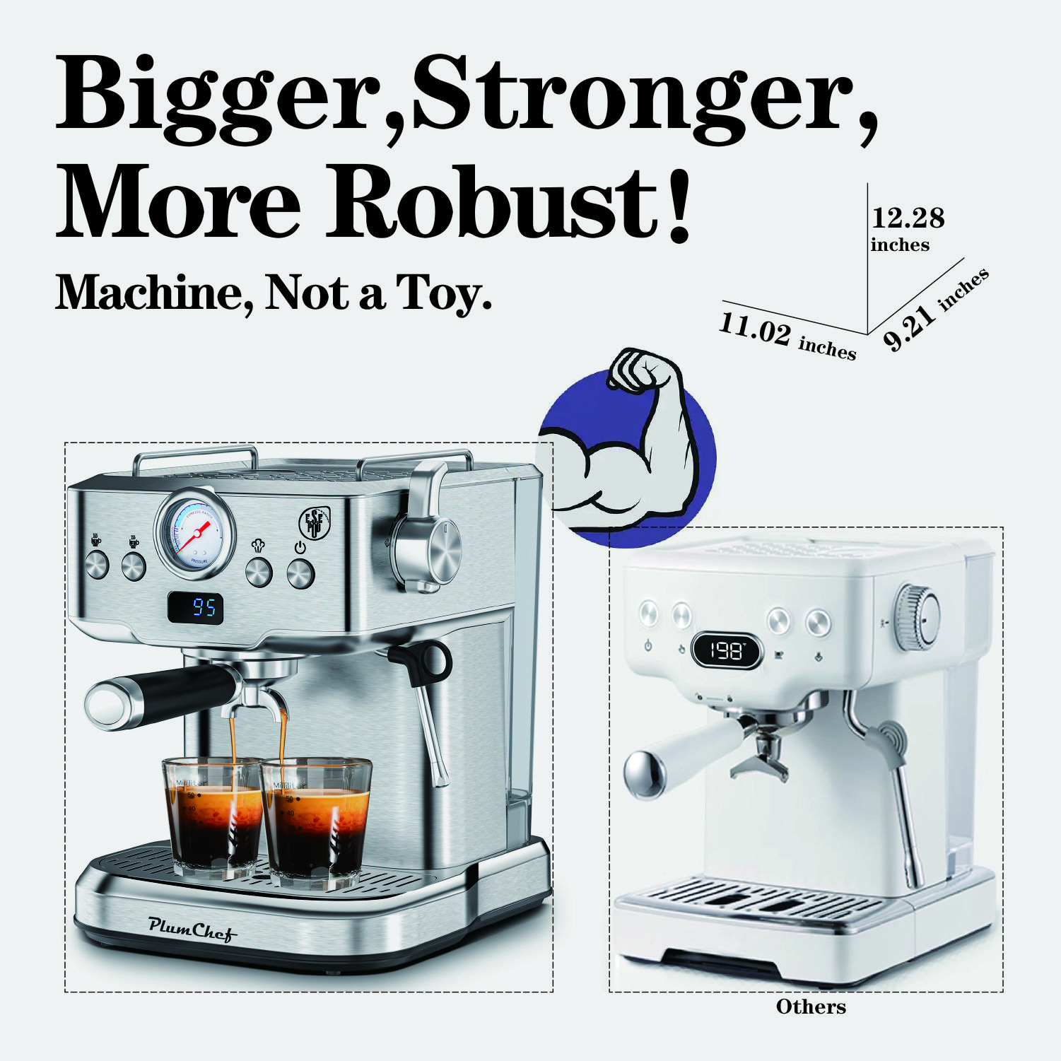 [Compact and Stylish Design]The size is 11*9.21*12.28 in, compact design make it easy to place in both the home and office; Stainless steel casing, styled design, equipped with a rotatable Milk Frother Steam Wand which you can texture creamy, rich microfoam milk to create amazing milk foam art and enhance the flavor of your brews, the 60 oz water tank allows you to brew multiple cups, which is detachable for easy refilling; and the drip tray is easy cleaning. It is the best choice for coffee lovers.