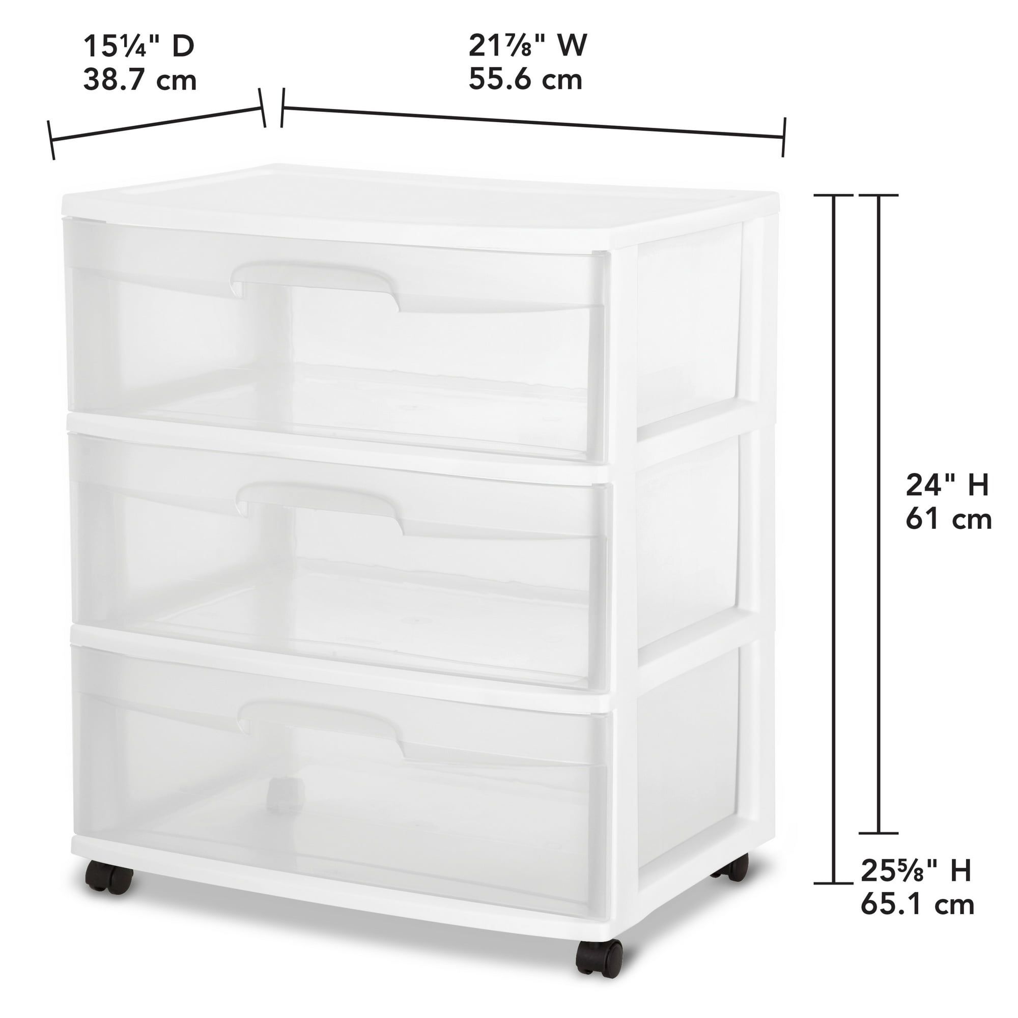 3 Drawer Wide Cart offers a practical and versatile storage solution for any room of the home! Organize a variety of household items where they are most frequently used - in the bedroom, kitchen / pantry, bathroom, craft room, nursery or dorm room. It can even double as a nightstand, dresser or way to make efficient use of closet space. Neatly store anything from clothing, accessories, and towels to craft supplies, health and beauty items, toys, and more. The drawer design features an integrated handle for easy opening and is clear, allowing contents to be easily identified, while keeping them contained. The drawer stop feature prevents drawers from being removed accidentally. Add the casters to create a rolling storage option, and easily move the Drawer Cart wherever it is needed. It's easy to get organized and keep your living spaces clutter-free with the 3 Drawer Wide Cart! The overall assembled dimensions of this item are 15 1/4" D x 21 7/8" W x 24" H.