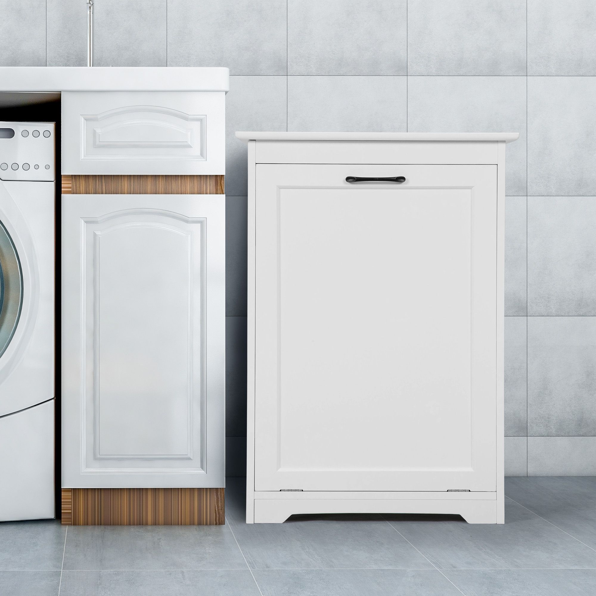[Thoughtful Design]: To improve the stability of the trash can cabinet and make it convenient to open the door; the anti-dump device and metal handle are thoughtfully designed.