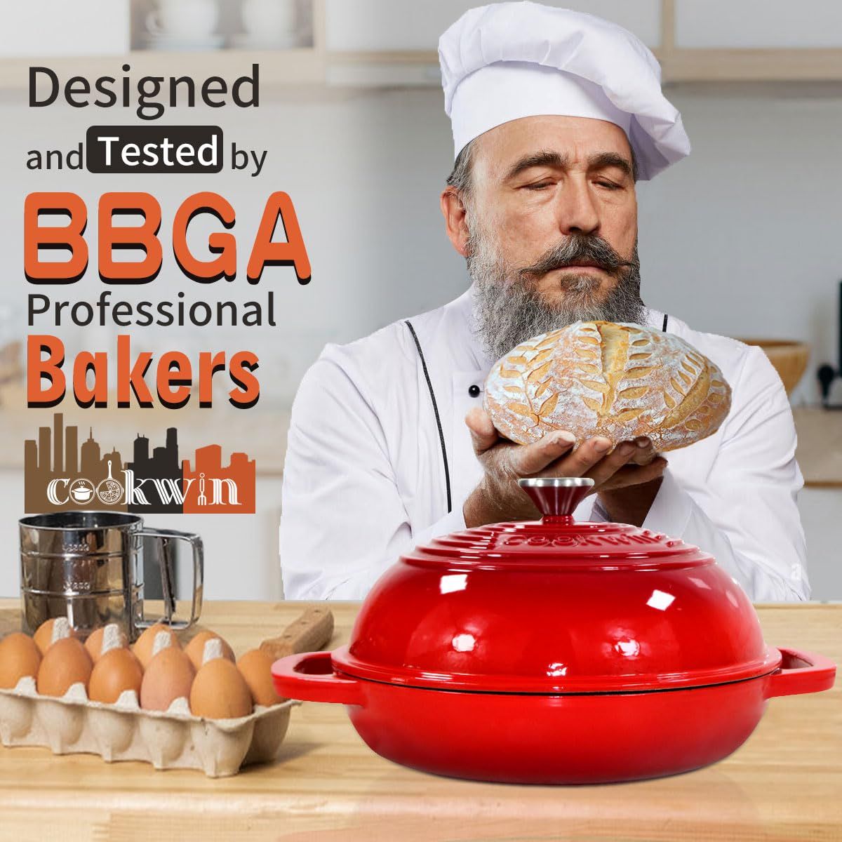 1.ULTIMATE BREAD OVEN:COOKWIN enameled cast iron Dutch oven is your ticket to bread-baking success! Measuring 14" in diameter with handles, 11" without handles,6.6" high with the knob,weighing 13.2 lbs,6 quart.Our bread oven includes a Non-Stick&Easy Clean,Reusable Silicone Baking Liner,sized 21" x 8.7",a Heat-resistant cap and 2 piece silicone handles-Designed for use when handling the pot's handle and lid,ensuring a comfortable grip and preventing burns.