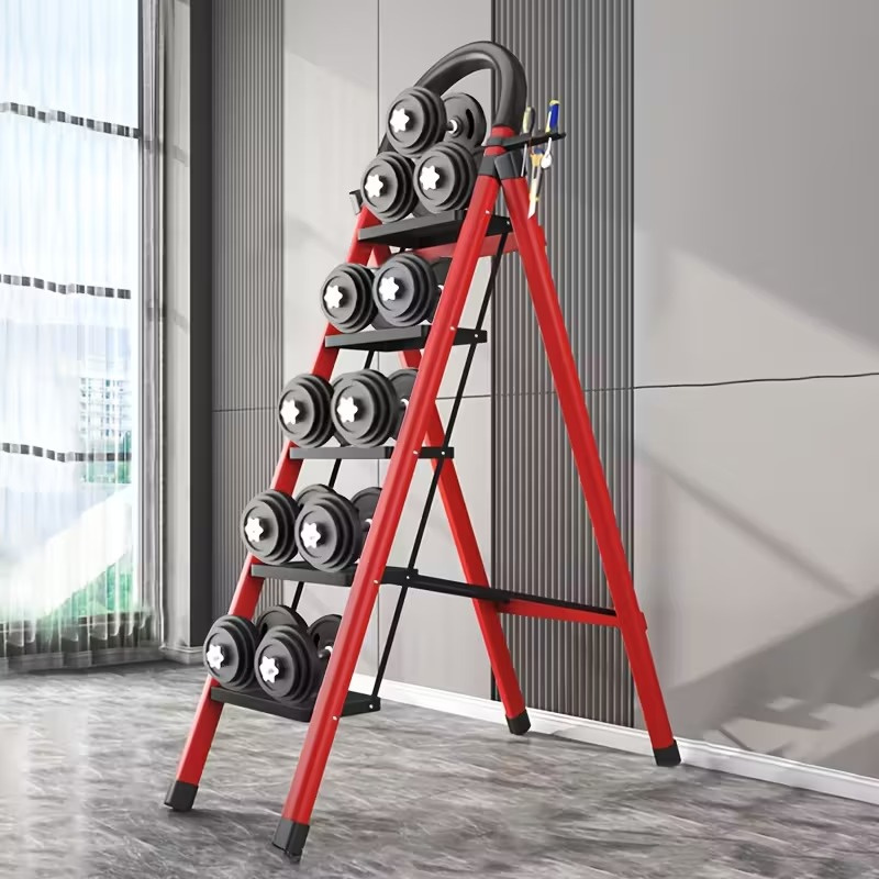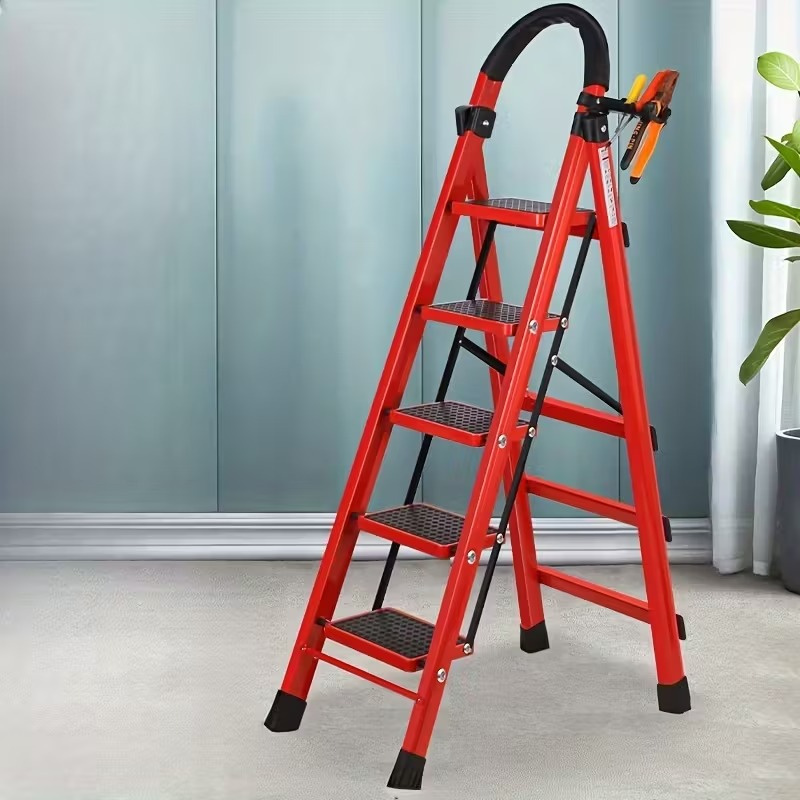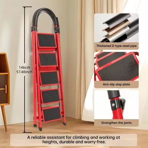 This 5-step folding ladder is designed for both safety and convenience. Built with heavy-duty steel and a stable frame, it supports up to 300 lbs and ensures reliable use for adults. Each wide step is equipped with non-slip rubber treads, providing firm footing and preventing slipping. The built-in tool tray at the top allows you to keep tools, screws, or small items within easy reach—perfect for home repairs, kitchen organization, or library use. The ladder folds compactly for easy storage and portability, making it an ideal helper for home, office, or commercial use.